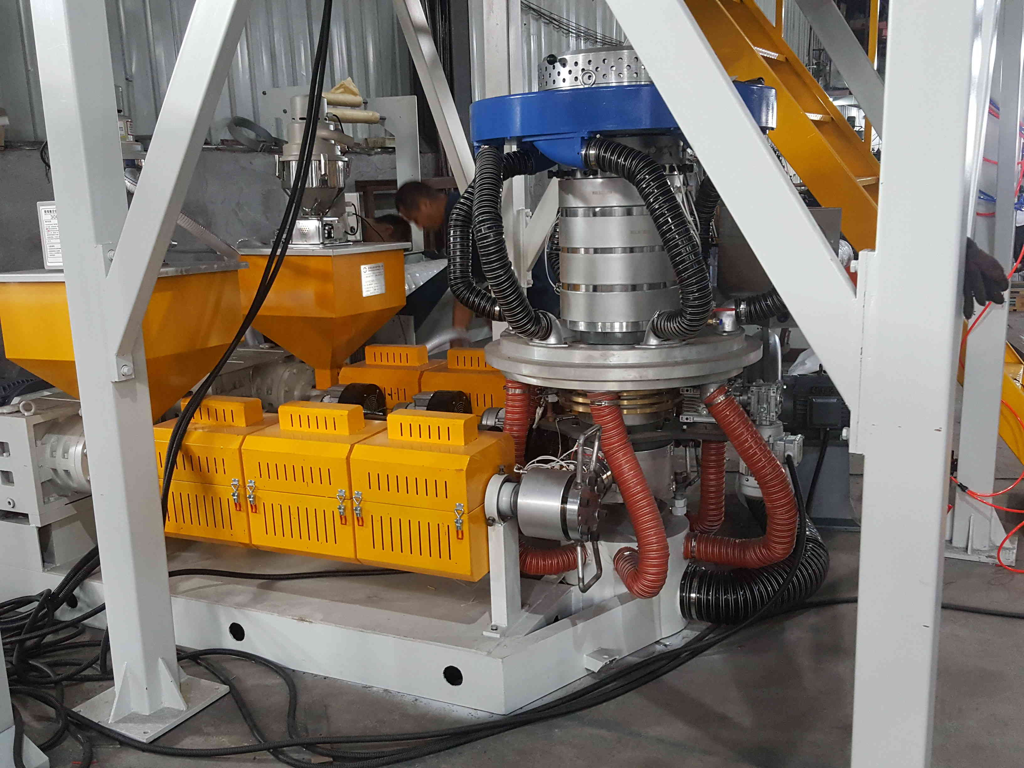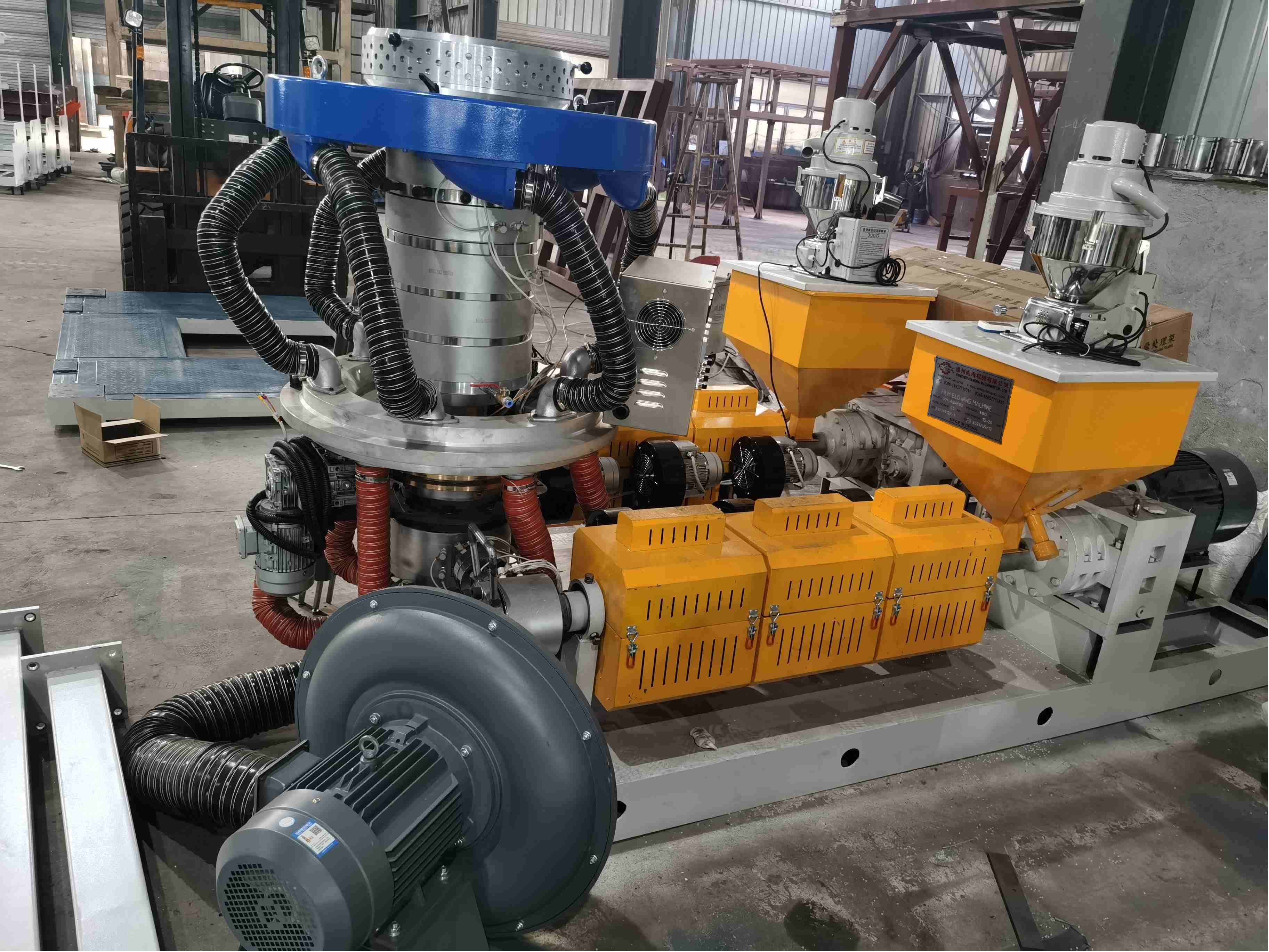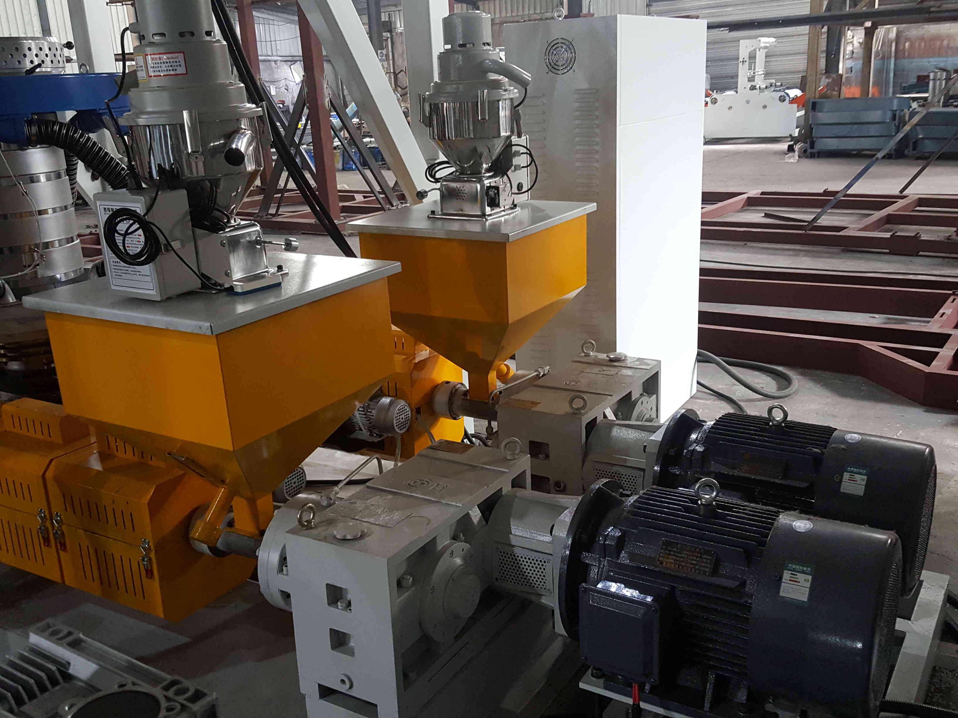 Эта машина Как цилиндр, так и винт экструдера изготовлены из высококачественной сплавной стали с помощью нитрации и точной отделки с лучшей твердостью и коррозионной устойчивостью. , научно разработанный, этот набор машин имеет две головки для одного экструдера с такими преимуществами, как увеличение производственных мощностей, экономия энергии, труда и мастерской площади и т. д.