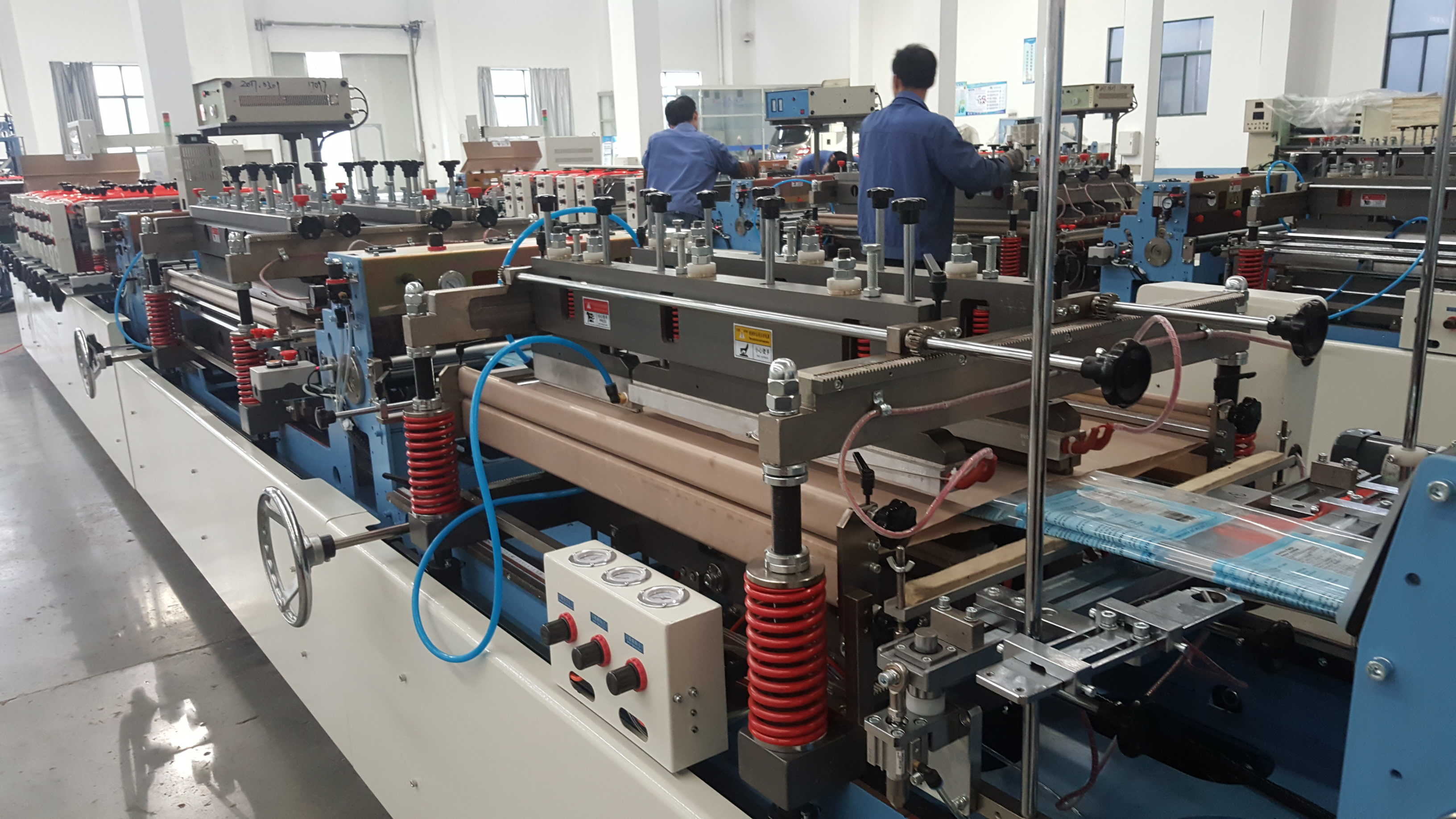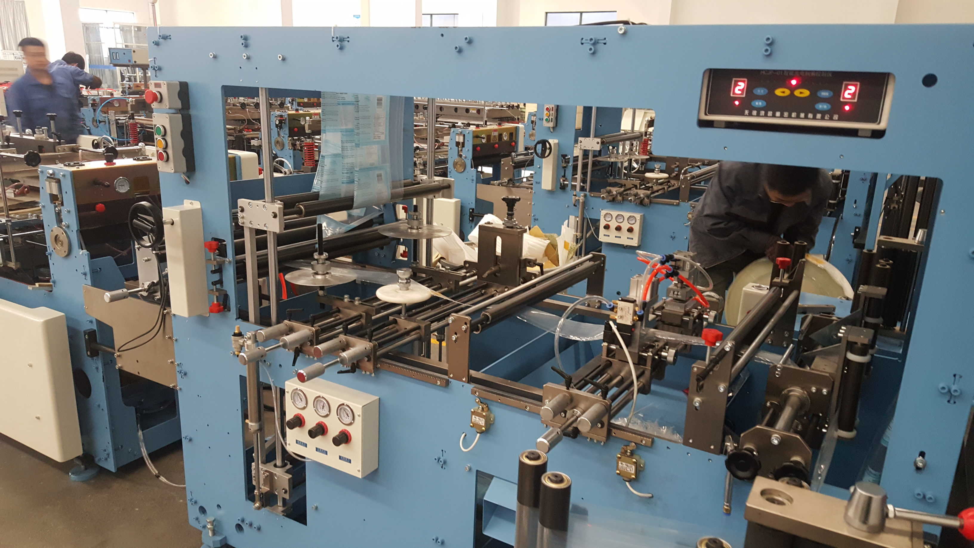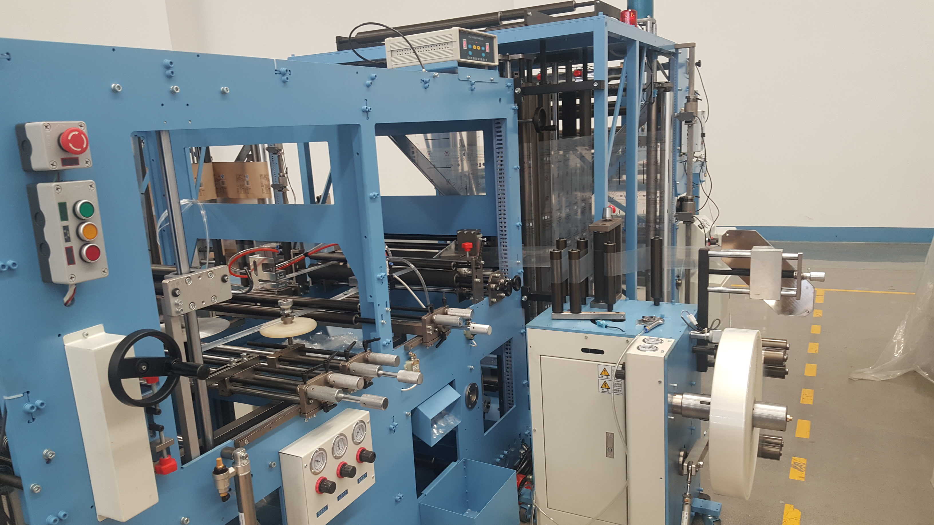 | Roll film unwinding unit | Body material:Horizontal air shaft,V-plate system and Triangle system,Definitive tension control system with power brake equipment. Bottom material:Horizontal air shaft,Triangular system,Definitive tension control system with power brake equipment. Zipper material:Horizontal shaft,friction tension control. |